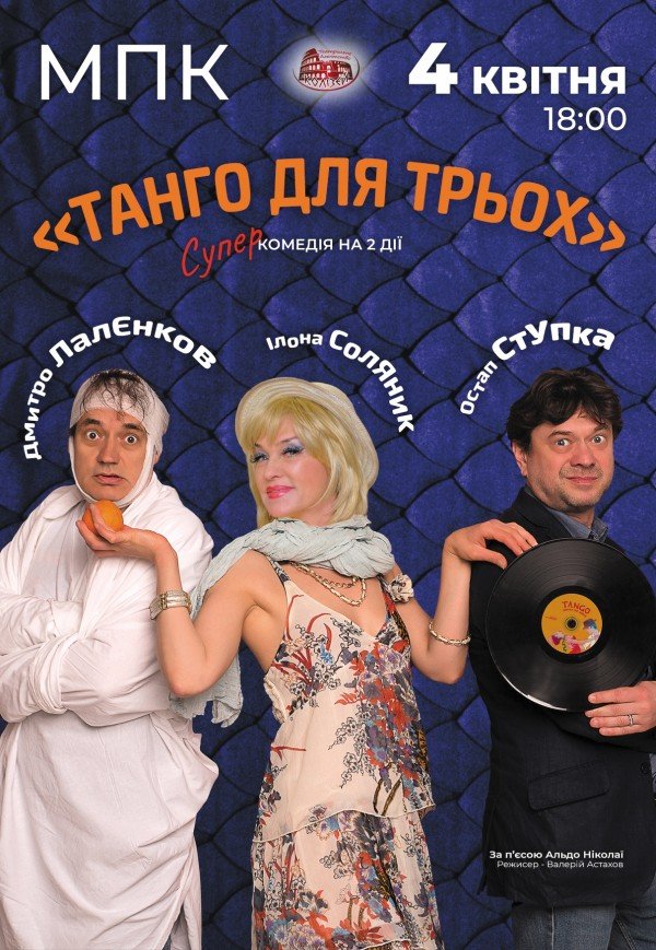 Спектакль "Танго на троих" состоится 4 апреля 2024, 18:00, четверг в ГДК. С помощью сервиса internet-bilet.ua, Вы сможете с легкостью забронировать, заказать и купить билеты на интересующий Вас концерт, спектакль, оперу, балет, мастер-классы, спортивные и детские мероприятия, оплатив их самым удобным для Вас способом: через интернет банковской картой VISA/MasterCard, наличными или курьером, если сделаете заказ билета c доставкой.