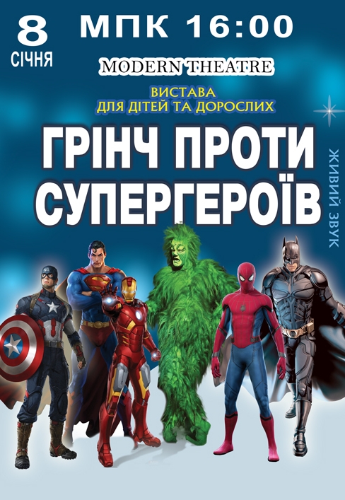 Вистава "Грінч проти супергероїв" відбудеться 8 січня 2026, 16:00, четвер в МПК. За допомогою сервісу internet-bilet.ua, Ви зможете з легкістю забронювати, замовити та купити квитки на концерт, спектакль, оперу, балет, майстер-класи, спортивні та дитячі заходи, що Вас цікавлять, оплативши їх найбільш зручним для Вас способом: через інтернет банківською карткою VISA/MasterCard, готівкою або кур'єром, якщо зробите замовлення квитка з доставкою.