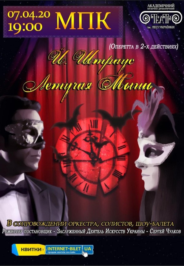 Оперета «Летюча миша» відбудеться 7 квітня 2020, 19:00, вівторок в МПК. За допомогою сервісу internet-bilet.ua, Ви зможете з легкістю забронювати, замовити та купити квитки на концерт, спектакль, оперу, балет, майстер-класи, спортивні та дитячі заходи, що Вас цікавлять, оплативши їх найбільш зручним для Вас способом: через інтернет банківською карткою VISA/MasterCard, готівкою або кур'єром, якщо зробите замовлення квитка з доставкою.